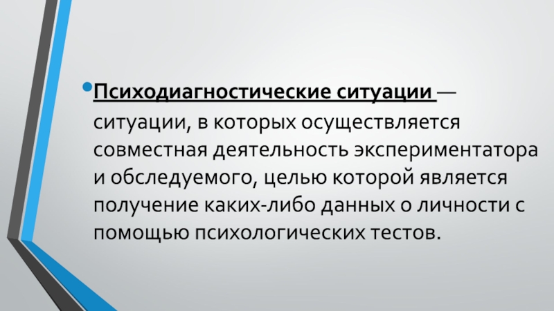 Слайд 11Психодиагностические ситуации — ситуации, в которых осуществляется совместная деятельность экспериментатора