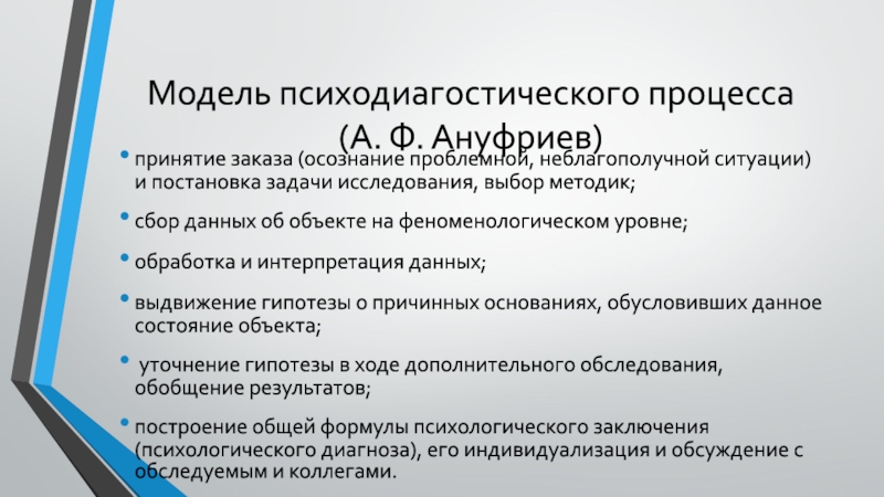 • главное, что психодиагност должен быть психологом, так как его задачей является интерпретация результатов обследования.