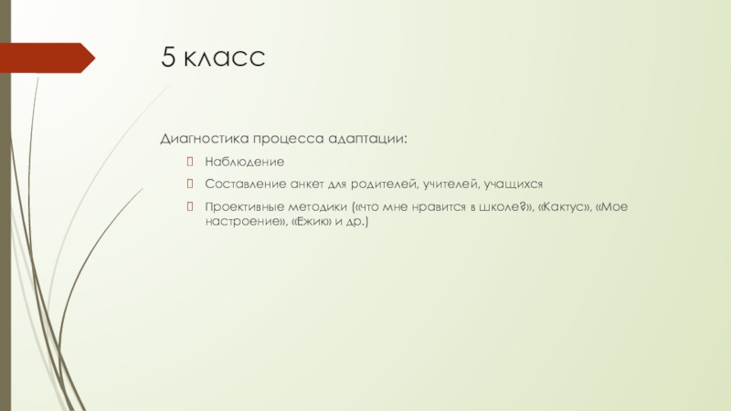 5 классДиагностика процесса адаптации:НаблюдениеСоставление анкет для родителей, учителей, учащихсяПроективные методики («что мне нравится в школе?», «Кактус», «Мое