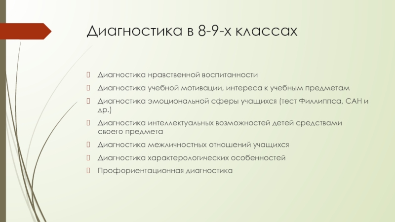 Диагностика в 8-9-х классахДиагностика нравственной воспитанностиДиагностика учебной мотивации, интереса к учебным предметамДиагностика эмоциональной сферы учащихся (тест Филлиппса,