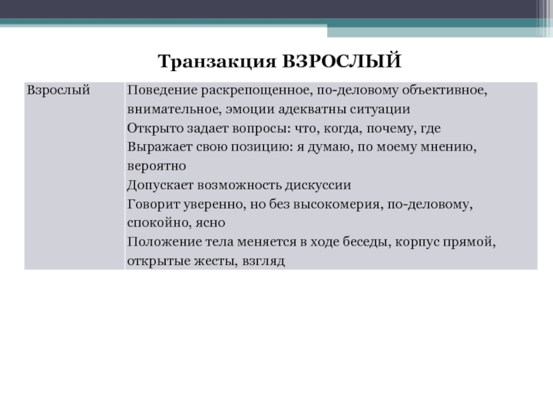 Если же один из участников взаимодействия адресуется к другому с позиции Взрослого, а тот отвечает ему с позиции Родителя, то взаимодействие нарушается и может вообще прекратиться (пересекающиеся транзакции)