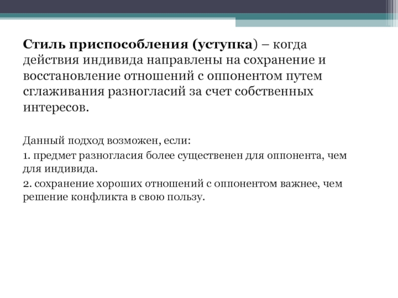 Слайд 17Стиль приспособления (уступка) – когда действия индивида направлены на сохранение