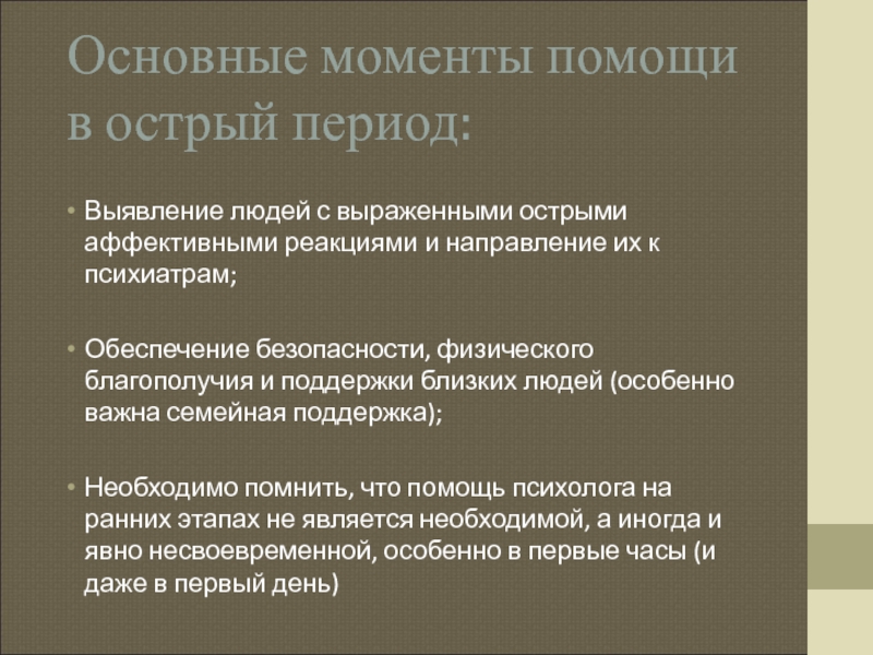 Необходимо помнить, что помощь психолога на ранних этапах не является необходимой, а иногда и явно несвоевременной, особенно в первые часы (и даже в первый день)