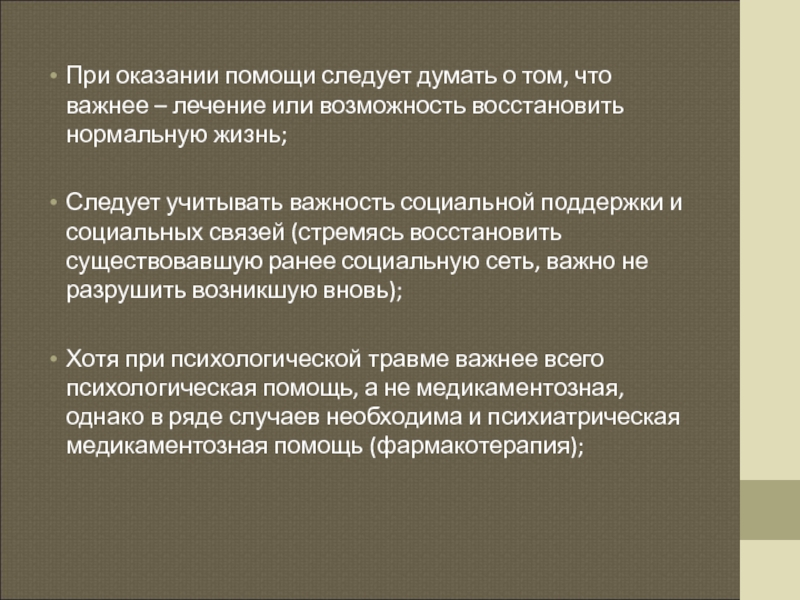 Хотя при психологической травме важнее всего психологическая помощь, а не медикаментозная, однако в ряде случаев необходима и психиатрическая медикаментозная помощь (фармакотерапия);