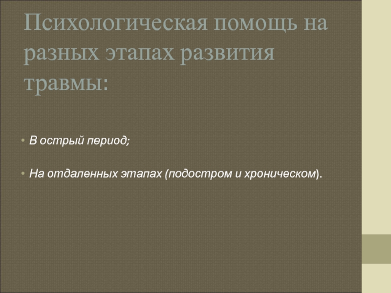 Слайд 2Психологическая помощь на разных этапах развития травмы: