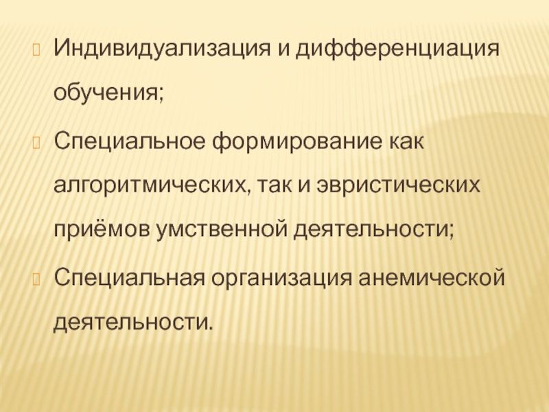 Индивидуализация и дифференциация обучения;Специальное формирование как алгоритмических, так и эвристических приёмов умственной деятельности;Специальная организация анемической деятельности.