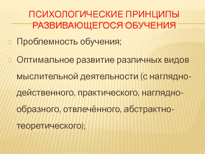 ПСИХОЛОГИЧЕСКИЕ ПРИНЦИПЫ РАЗВИВАЮЩЕГОСЯ ОБУЧЕНИЯПроблемность обучения;Оптимальное развитие различных видов мыслительной деятельности (с наглядно-действенного, практического, наглядно-образного, отвлечённого, абстрактно-теоретического);