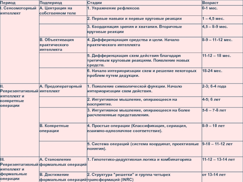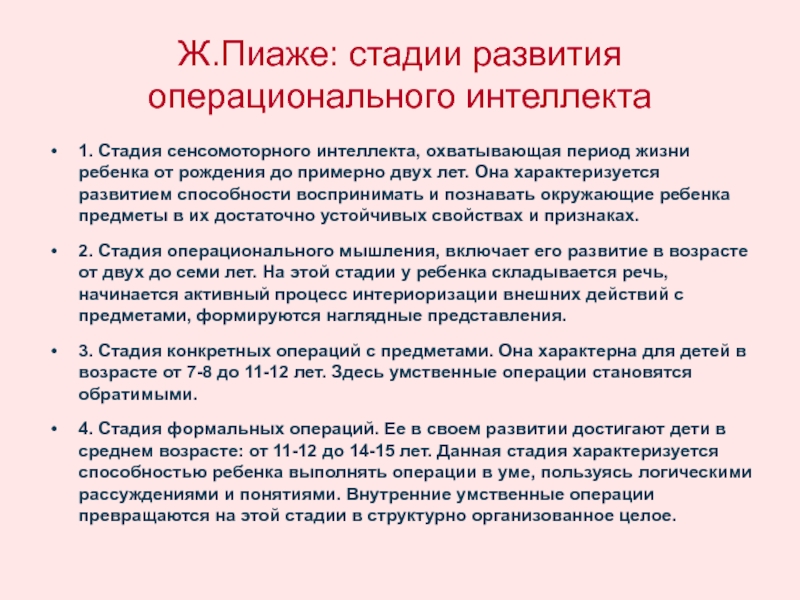 Слайд 40Ж.Пиаже: стадии развития операционального интеллекта
