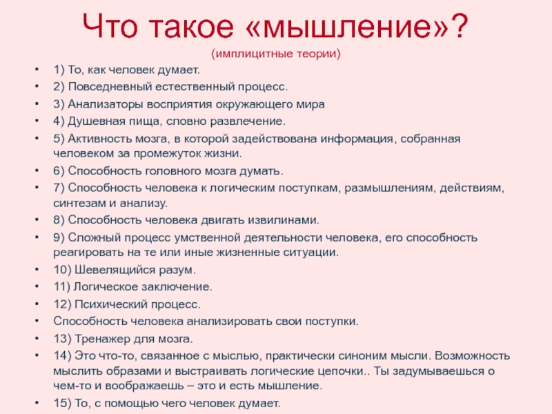 9) Сложный процесс умственной деятельности человека, его способность реагировать на те или иные жизненные ситуации.