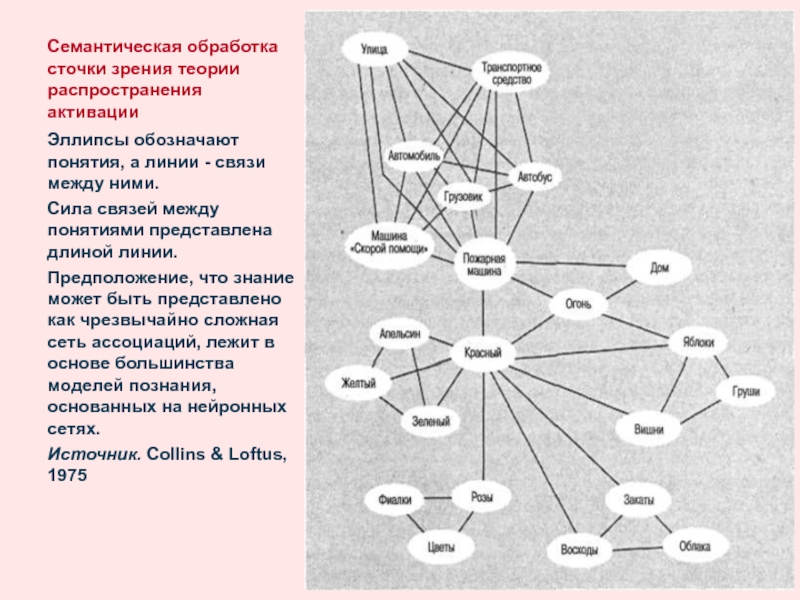 Слайд 14Семантическая обработка сточки зрения теории распространения активации