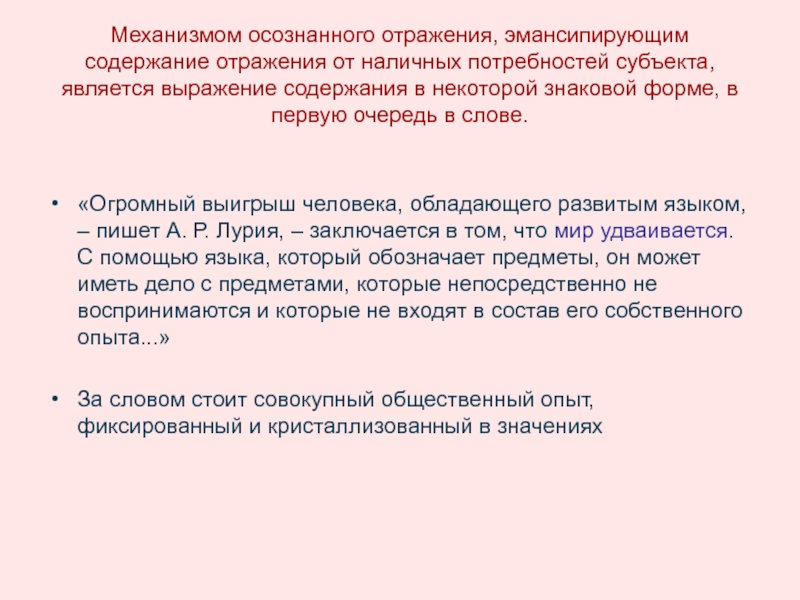 «Огромный выигрыш человека, обладающего развитым языком, – пишет А. Р. Лурия, – заключается в том, что мир удваивается. С помощью языка, который обозначает предметы, он может иметь дело с предметами, которые непосредственно не воспринимаются и которые не входят в состав его собственного опыта...»