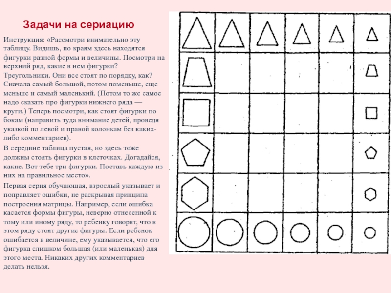 Первая серия обучающая, взрослый указывает и поправляет ошибки, не раскрывая принципа построения матрицы. Например, если ошибка касается формы фигуры, неверно отнесенной к тому или иному ряду, то ребенку говорят, что в этом ряду стоят другие фигуры. Если ребенок ошибается в величине, ему указывается, что его фигурка слишком большая (или маленькая) для этого места. Никаких других комментариев делать нельзя.