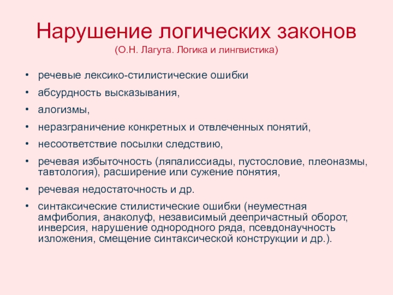 синтаксические стилистические ошибки (неуместная амфиболия, анаколуф, независимый деепричастный оборот, инверсия, нарушение однородного ряда, псевдонаучность изложения, смещение синтаксической конструкции и др.).