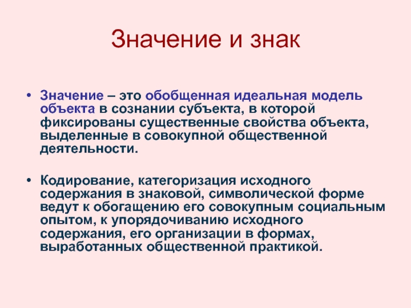 Кодирование, категоризация исходного содержания в знаковой, символической форме ведут к обогащению его совокупным социальным опытом, к упорядочиванию исходного содержания, его организации в формах, выработанных общественной практикой.
