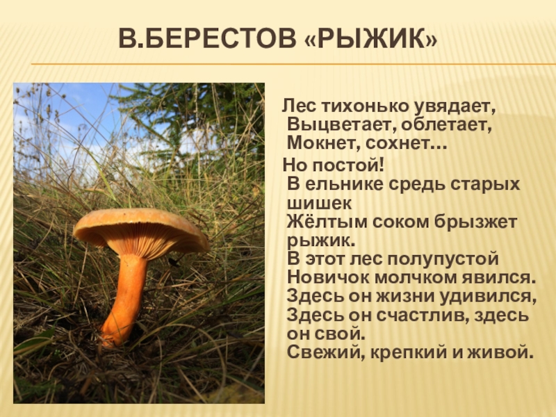 В.Берестов «Рыжик»     Лес тихонько увядает, Выцветает, облетает, Мокнет, сохнет…  Но постой! В