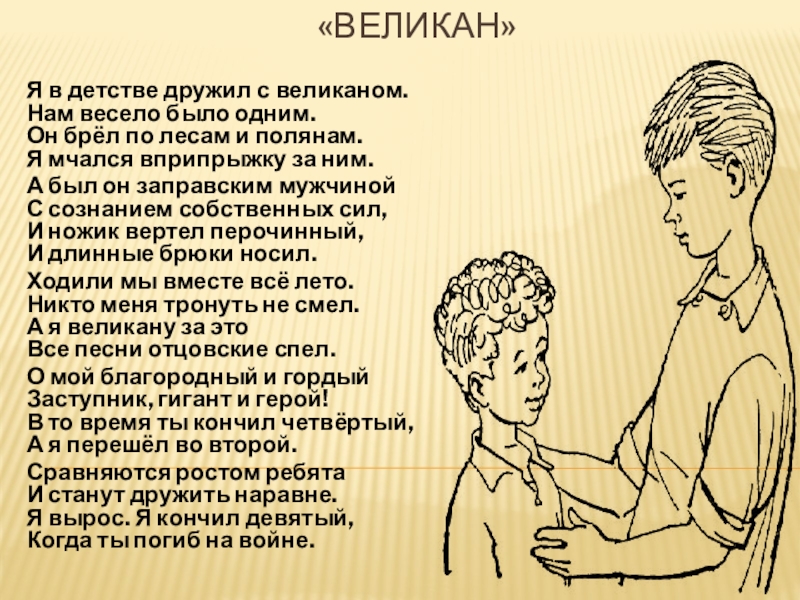 «ВЕЛИКАН»Я в детстве дружил с великаном. Нам весело было одним. Он брёл по лесам и полянам. Я