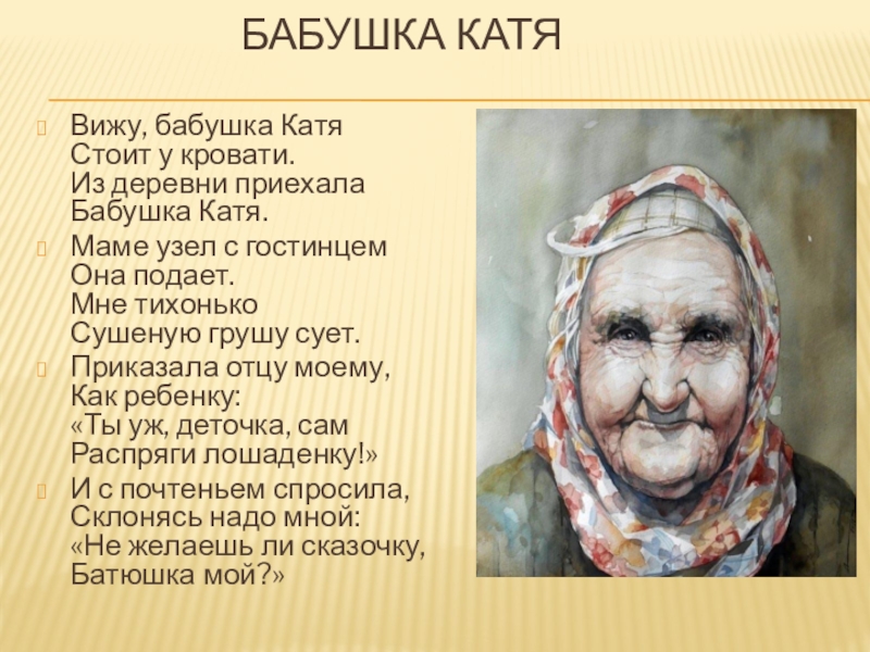 Вижу, бабушка Катя Стоит у кровати. Из деревни приехала Бабушка Катя.