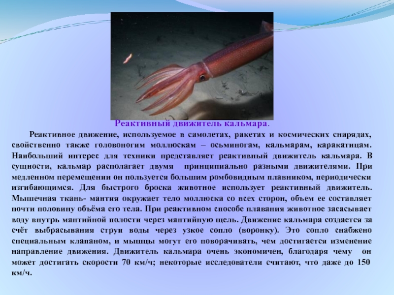 кальмарам, каракатицам. Наибольший интерес для техники представляет реактивный движитель кальмара. В сущности, кальмар располагает двумя принципиально разными движителями. При медленном перемещении он пользуется большим ромбовидным плавником, периодически изгибающимся. Для быстрого броска животное использует реактивный движитель. Мышечная ткань- мантия окружает тело моллюска со всех сторон, объем ее составляет почти половину объёма его тела. При реактивном способе плавания животное засасывает воду внутрь мантийной полости через мантийную щель. Движение кальмара создается за счёт выбрасывания струи воды через узкое сопло (воронку). Это сопло снабжено специальным клапаном, и мышцы могут его поворачивать, чем достигается изменение направление движения. Движитель кальмара очень экономичен, благодаря чему он может достигать скорости 70 км/ч; некоторые исследователи считают, что даже до 150 км/ч.