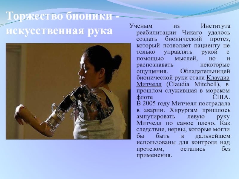 с помощью мыслей, но и распознавать некоторые ощущения. Обладательницей бионической руки стала Клаудиа Митчелл (Claudia Mitchell), в прошлом служившая в морском флоте США.