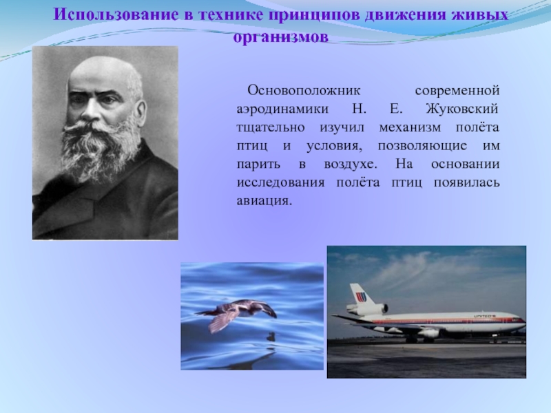 Слайд 7 Основоположник современной аэродинамики Н. Е. Жуковский тщательно изучил механизм полёта