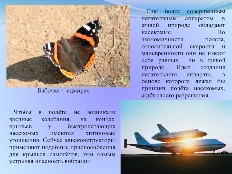 Слайд 8 Ещё более совершенным летательным аппаратом в живой природе обладают насекомые.