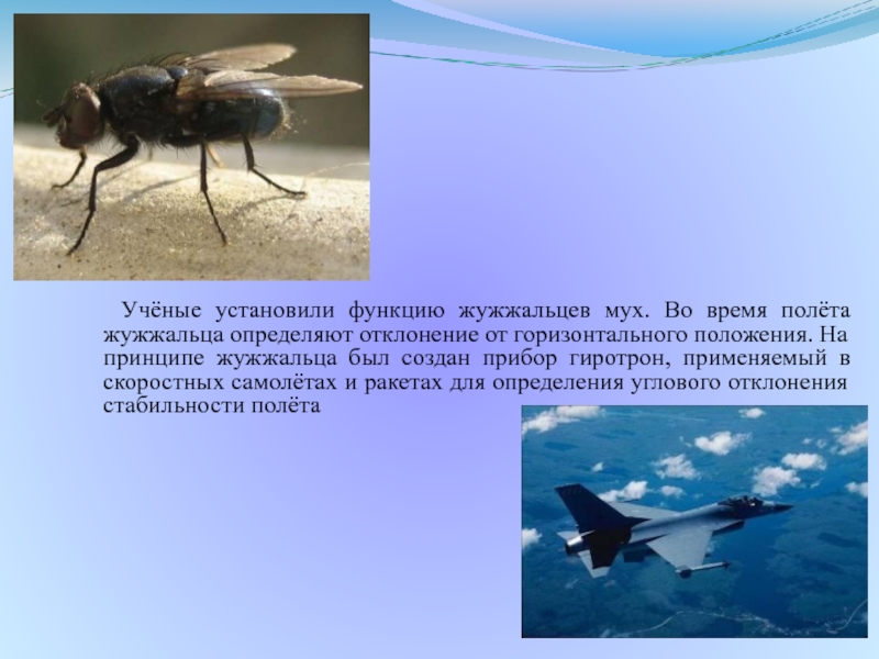 Слайд 9 Учёные установили функцию жужжальцев мух. Во время полёта жужжальца определяют