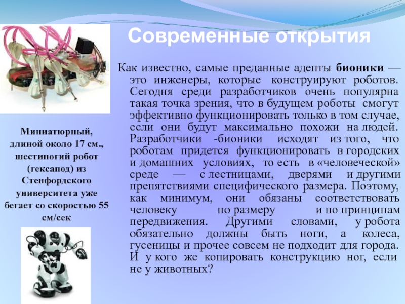 зрения, что в будущем роботы смогут эффективно функционировать только в том случае, если они будут максимально похожи на людей. Разработчики -бионики исходят из того, что роботам придется функционировать в городских и домашних условиях, то есть в «человеческой» среде — с лестницами, дверями и другими препятствиями специфического размера. Поэтому, как минимум, они обязаны соответствовать человеку по размеру и по принципам передвижения. Другими словами, у робота обязательно должны быть ноги, а колеса, гусеницы и прочее совсем не подходит для города. И у кого же копировать конструкцию ног, если не у животных?