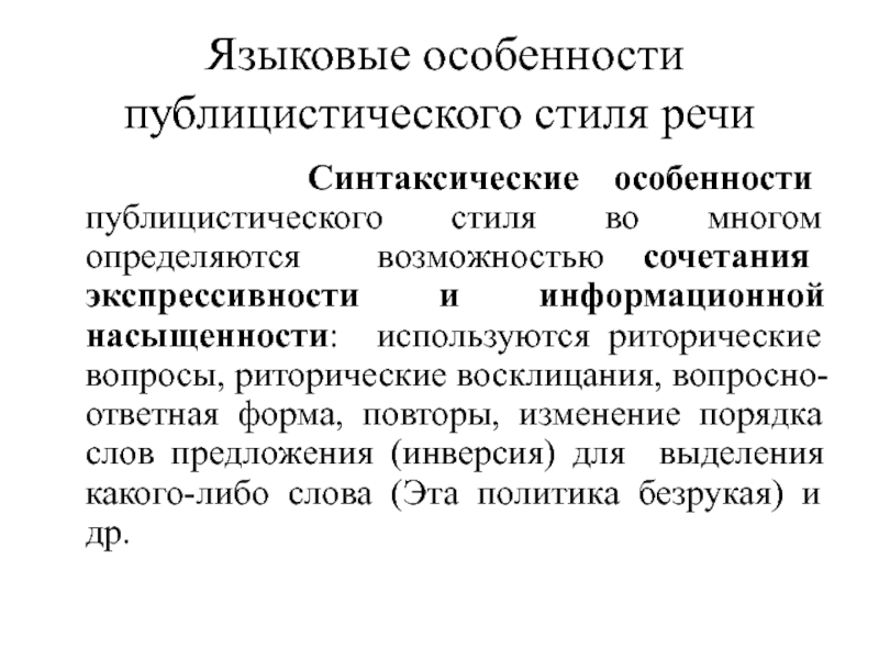 информационной насыщенности: используются риторические вопросы, риторические восклицания, вопросно-ответная форма, повторы, изменение порядка слов предложения (инверсия) для выделения какого-либо слова (Эта политика безрукая) и др.