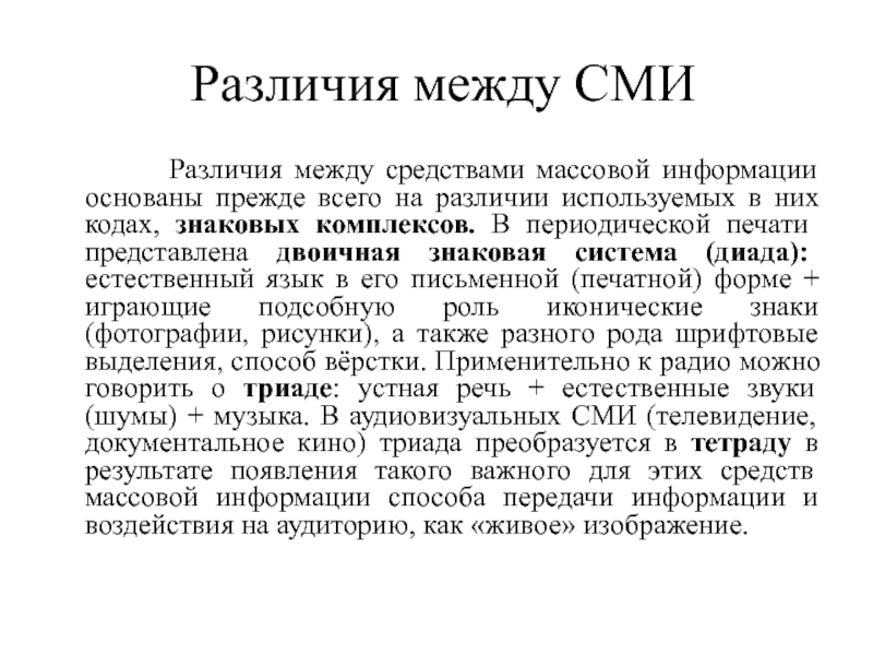 в них кодах, знаковых комплексов. В периодической печати представлена двоичная знаковая система (диада): естественный язык в его письменной (печатной) форме + играющие подсобную роль иконические знаки (фотографии, рисунки), а также разного рода шрифтовые выделения, способ вёрстки. Применительно к радио можно говорить о триаде: устная речь + естественные звуки (шумы) + музыка. В аудиовизуальных СМИ (телевидение, документальное кино) триада преобразуется в тетраду в результате появления такого важного для этих средств массовой информации способа передачи информации и воздействия на аудиторию, как «живое» изображение.