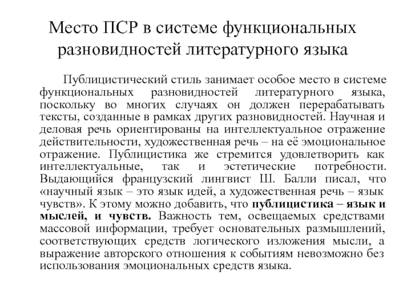 функциональных разновидностей литературного языка, поскольку во многих случаях он должен перерабатывать тексты, созданные в рамках других разновидностей. Научная и деловая речь ориентированы на интеллектуальное отражение действительности, художественная речь – на её эмоциональное отражение. Публицистика же стремится удовлетворить как интеллектуальные, так и эстетические потребности. Выдающийся французский лингвист Ш. Балли писал, что «научный язык – это язык идей, а художественная речь – язык чувств». К этому можно добавить, что публицистика – язык и мыслей, и чувств. Важность тем, освещаемых средствами массовой информации, требует основательных размышлений, соответствующих средств логического изложения мысли, а выражение авторского отношения к событиям невозможно без использования эмоциональных средств языка.