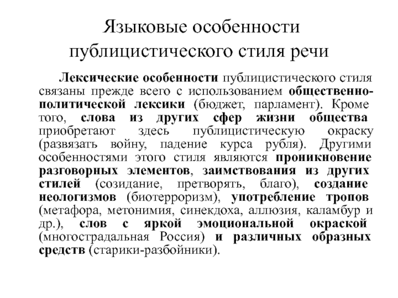 лексики (бюджет, парламент). Кроме того, слова из других сфер жизни общества приобретают здесь публицистическую окраску (развязать войну, падение курса рубля). Другими особенностями этого стиля являются проникновение разговорных элементов, заимствования из других стилей (созидание, претворять, благо), создание неологизмов (биотерроризм), употребление тропов (метафора, метонимия, синекдоха, аллюзия, каламбур и др.), слов с яркой эмоциональной окраской (многострадальная Россия) и различных образных средств (старики-разбойники).