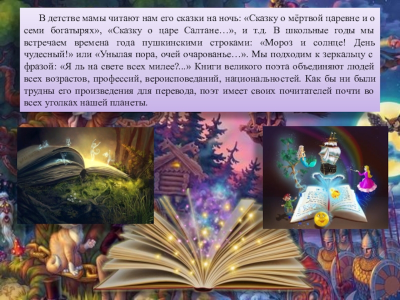 «Сказку о царе Салтане…», и т.д. В школьные годы мы встречаем времена года пушкинскими строками: «Мороз и солнце! День чудесный!» или «Унылая пора, очей очарованье…». Мы подходим к зеркальцу с фразой: «Я ль на свете всех милее?...» Книги великого поэта объединяют людей всех возрастов, профессий, вероисповеданий, национальностей. Как бы ни были трудны его произведения для перевода, поэт имеет своих почитателей почти во всех уголках нашей планеты.