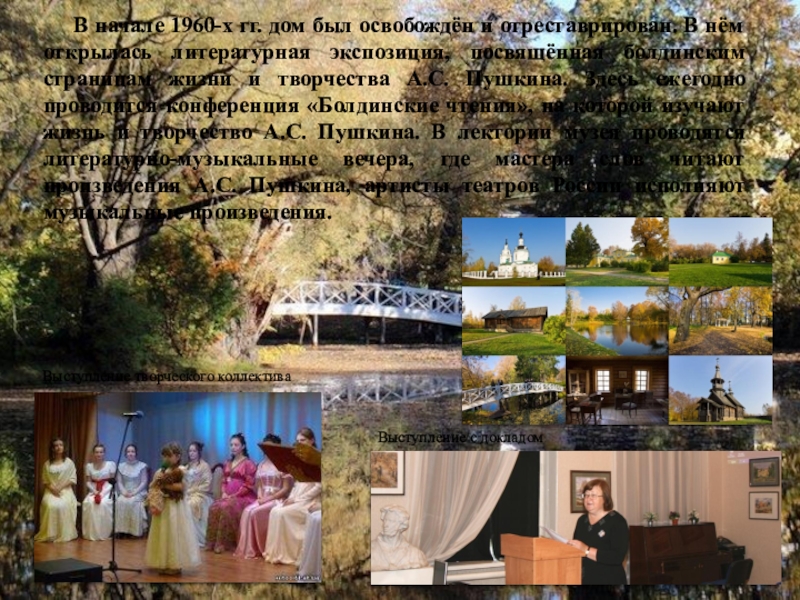жизни и творчества А.С. Пушкина. Здесь ежегодно проводится конференция «Болдинские чтения», на которой изучают жизнь и творчество А.С. Пушкина. В лектории музея проводятся литературно-музыкальные вечера, где мастера слов читают произведения А.С. Пушкина, артисты театров России исполняют музыкальные произведения.