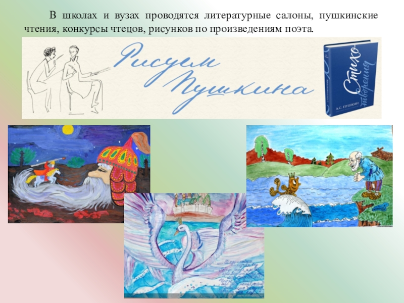 пушкинские чтения, конкурсы чтецов, рисунков по произведениям поэта.