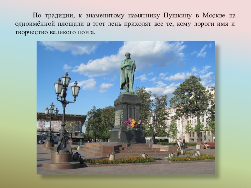 Слайд 19 По традиции, к знаменитому памятнику Пушкину в