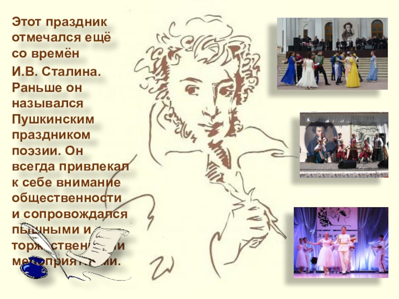 Этот праздник отмечался ещё со времён И.В. Сталина. Раньше он назывался Пушкинским праздником поэзии. Он всегда привлекал