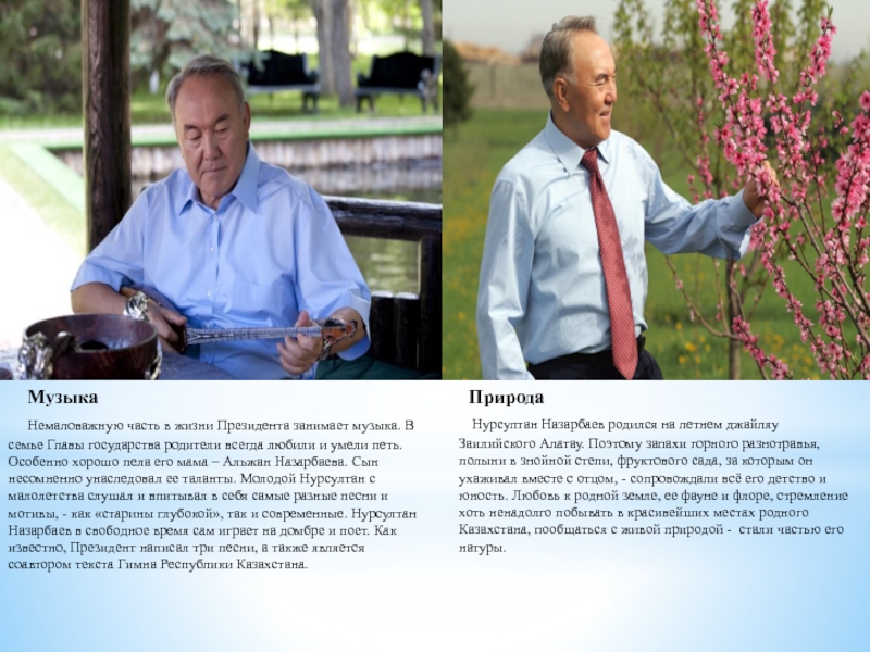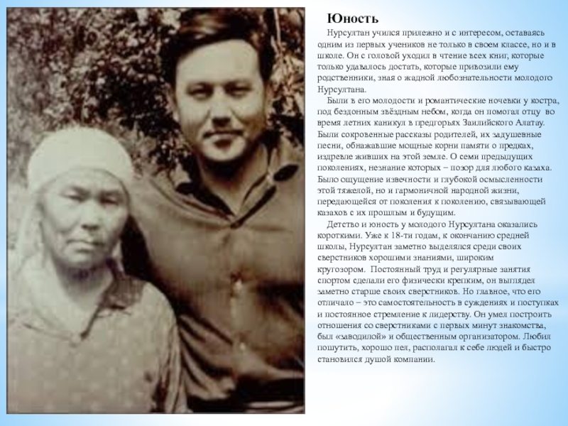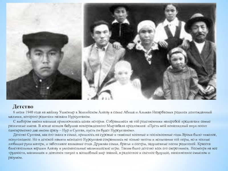 Назарбаевых родился долгожданный мальчик, которого родители назвали Нурсултаном.С выбором имени малыша приключилась целая история. Собравшиеся на той родственники наперебой предлагали самые различные имена. В конце концов бабушка новорожденного Мырзабала предложила: «Пусть мой ненаглядный внук носит одновременно два имени сразу – Нур и Султан, пусть он будет Нурсултаном». Детство Султана, как его звали в семье, пришлось на суровые и тяжелые военные и послевоенные годы.Время было тяжелое, полуголодное. Но в детской памяти молодого Нурсултана сохранились не только тяготы и испытания той поры, но и теплые любящие руки матери, и заботливое внимание отца. Дружная семья, братья и сестры, задушевные песни родителей. Красота блистательных вершин Алатау и увлекательные мальчишеские игры. Таким было детство всех его сверстников. Несмотря на все трудности, мальчишек и девчонок тянуло в волшебный мир знаний, в радостное и светлое будущее, наполненное смыслом и разумом.