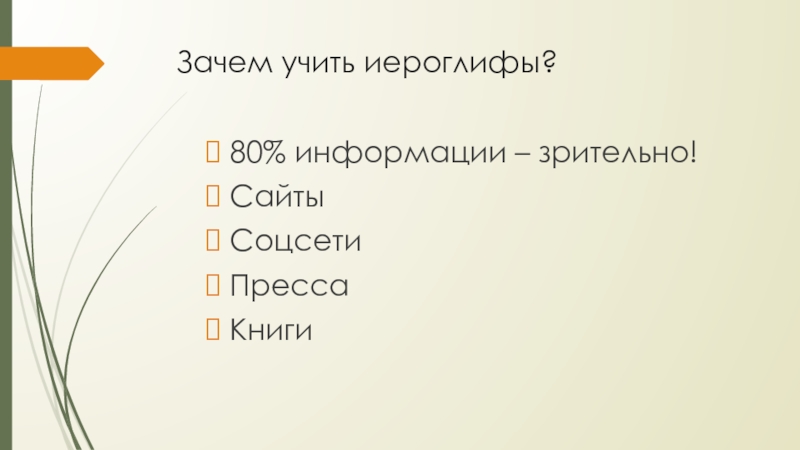 Зачем учить иероглифы?80% информации – зрительно!СайтыСоцсетиПрессаКниги