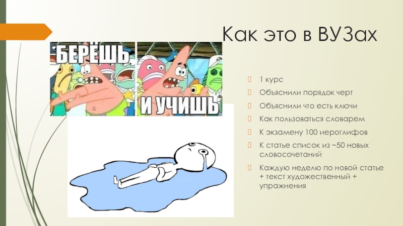 Как это в ВУЗах1 курсОбъяснили порядок чертОбъяснили что есть ключиКак пользоваться словаремК экзамену 100 иероглифовК статье список