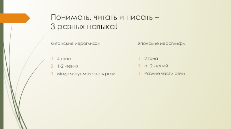 Понимать, читать и писать –  3 разных навыка! Китайские иероглифы4 тона1-2 чтенияМоделируемая часть речиЯпонские иероглифы2 тонаот