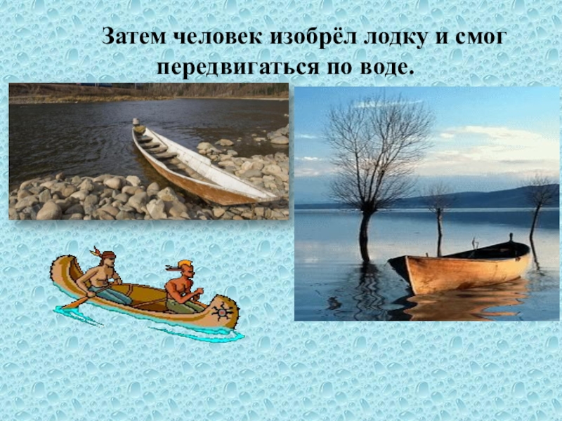 Затем человек изобрёл лодку и смог передвигаться по воде.