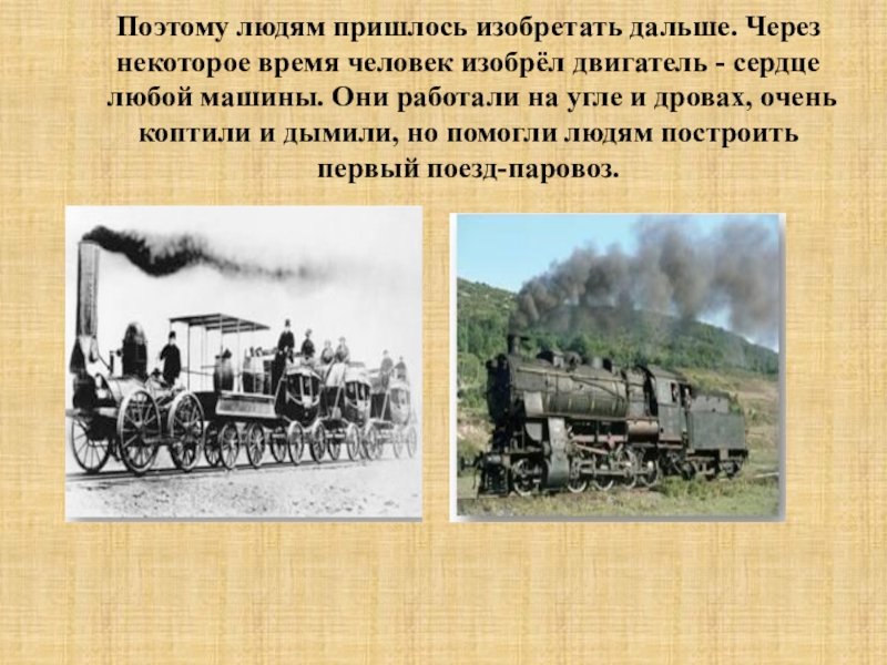 дровах, очень коптили и дымили, но помогли людям построить первый поезд-паровоз.