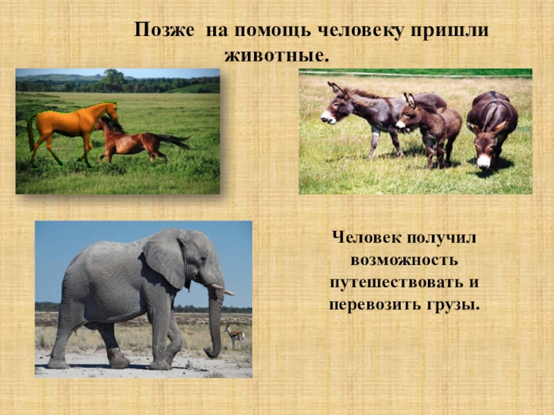Позже на помощь человеку пришли животные.Человек получил возможность путешествовать и