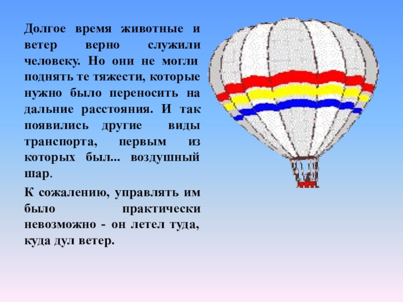 дальние расстояния. И так появились другие виды транспорта, первым из которых был... воздушный шар.