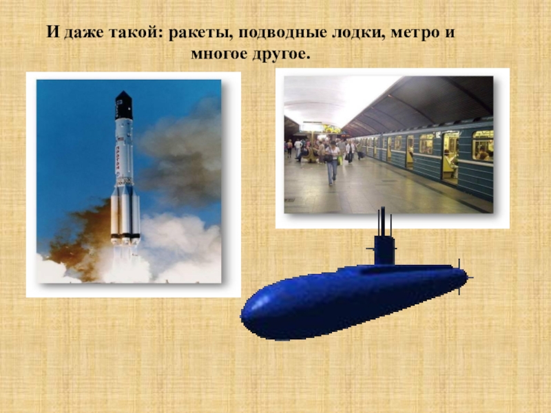 Слайд 12И даже такой: ракеты, подводные лодки, метро и многое другое.