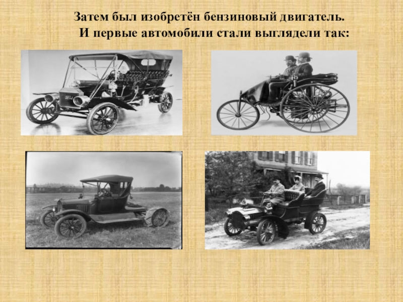 Затем был изобретён бензиновый двигатель.  И первые автомобили стали выглядели так: