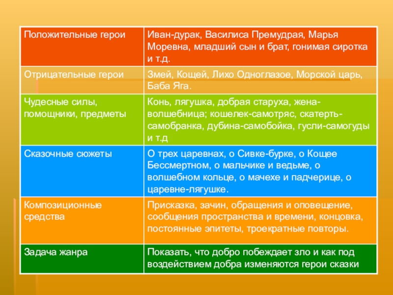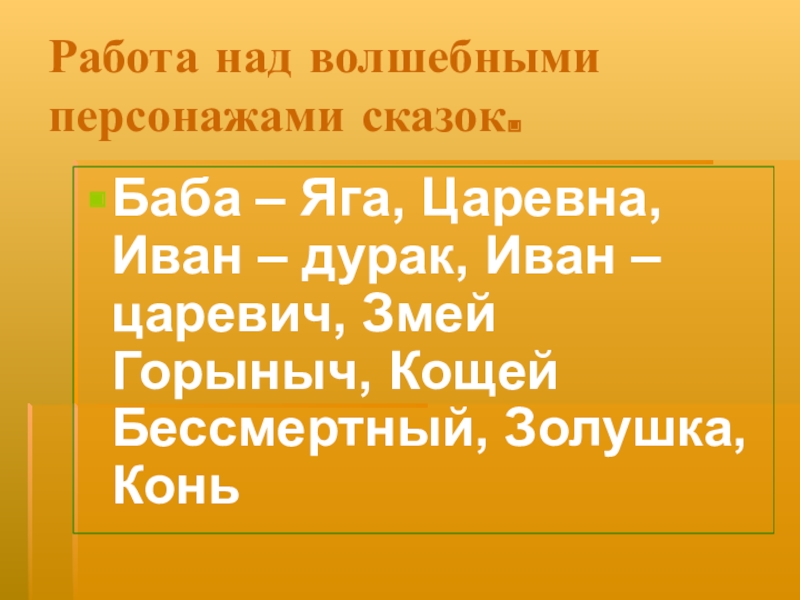 дурак, Иван – царевич, Змей Горыныч, Кощей Бессмертный, Золушка, Конь