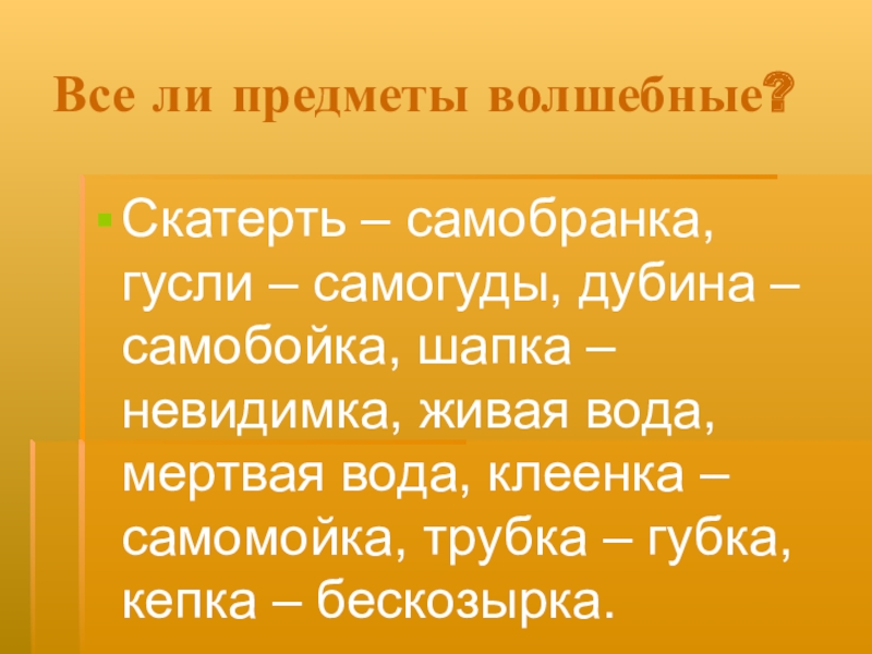 – самобойка, шапка – невидимка, живая вода, мертвая вода, клеенка