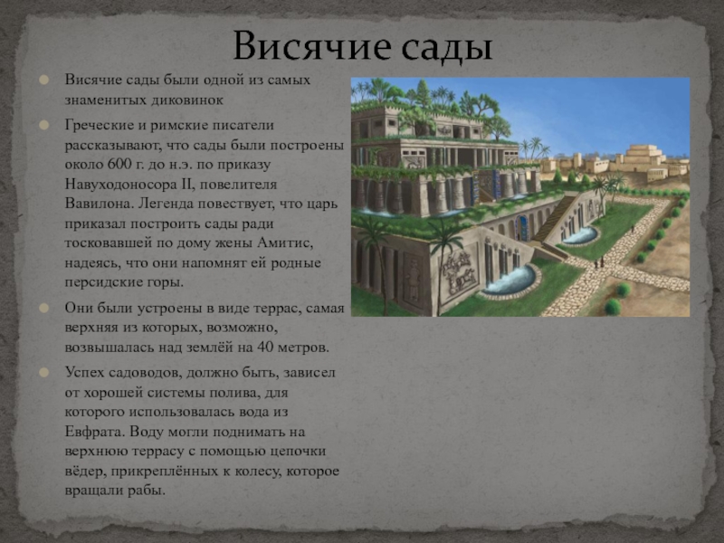 до н.э. по приказу Навуходоносора II, повелителя Вавилона. Легенда повествует, что царь приказал построить сады ради тосковавшей по дому жены Амитис, надеясь, что они напомнят ей родные персидские горы.