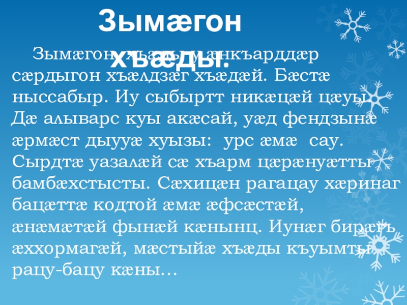дыууӕ хуызы: урс ӕмӕ сау. Сырдтӕ уазалӕй сӕ хъарм цӕрӕнуӕтты бамбӕхстысты. Сӕхицӕн рагацау хӕринаг бацӕттӕ кодтой ӕмӕ ӕфсӕстӕй, ӕнӕмӕтӕй фынӕй кӕнынц. Иунӕг бирӕгъ ӕххормагӕй, мӕстыйӕ хъӕды къуымты рацу-бацу кӕны…Зымӕгон хъӕды.